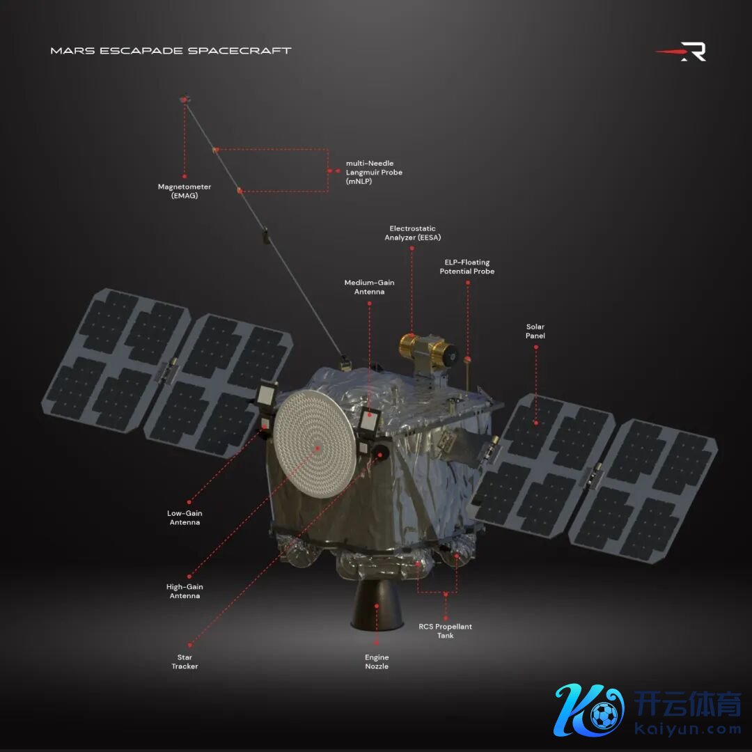 ▲火箭顶部搭载NASA ESCAPADE双探伤器(Escape and Plasma Acceleration and Dynamics Explorers,逃跑、等离子体加快与能源学探伤器)。这两颗紧凑型低资本探伤卫星,永诀定名为「蓝色」和「金色」。由加州大学伯克利分校空间科学实验室处分,属于NASA袖珍翻新行星探索(SIMPLEx)名目,由火箭实验室(Rocket Lab)公司竖立,总资本仅为1.074亿好意思元,这关于常见动辄十亿好意思元级的火星任务而言,这是一次极致性价比尝试。