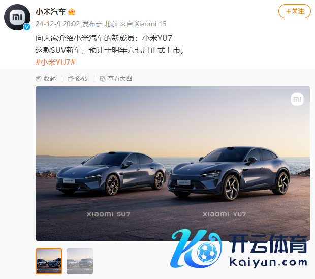 12月9日晚间,汽车在官方微博称,小米YU7展望于来岁六七月认真上市,这是一款SUV车型,亦然小米的第二款新车。