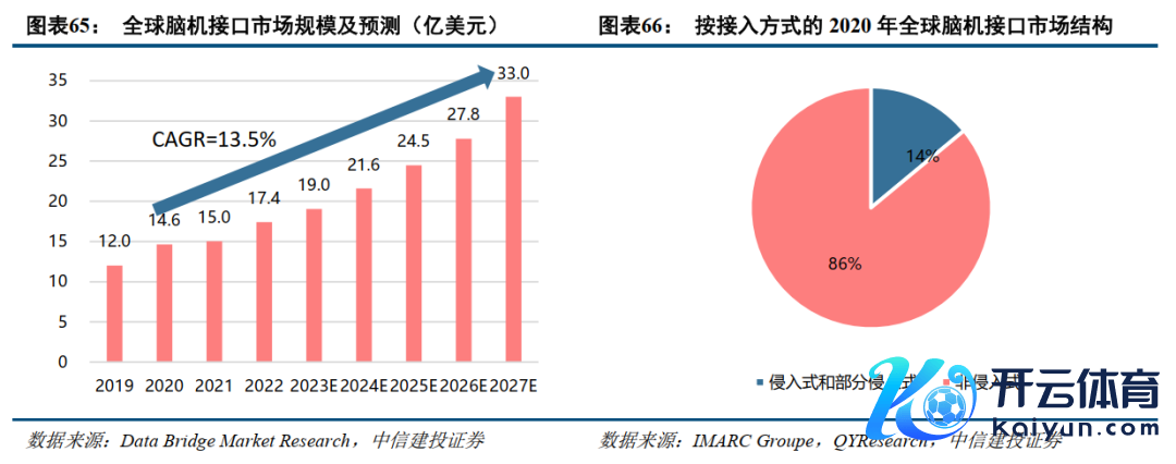 脑机接口市集范围增速快,猜想2019-2027年复合增速达到13.5%。根据国际市集商讨机构IMARCGroupe的数据,自2019年起,寰球脑机接口市集范围逐年攀升,猜意象2027年将达到33亿好意思元的范围,年复合增长率约13.5%。非侵入式脑机接口是研发重点标的,2020年市集份额占脑机接口市集范围的86%。鉴于本领和伦理安全等问题,现时的商讨要点更多倾向于非侵入式脑机接口本领的开发与应用,无为应用于脑疾病的早期筛查、诊疗及医疗保健。侵入式脑机接口本领主要应用于难治性脑部疾病的调理康复,占比约为14%。