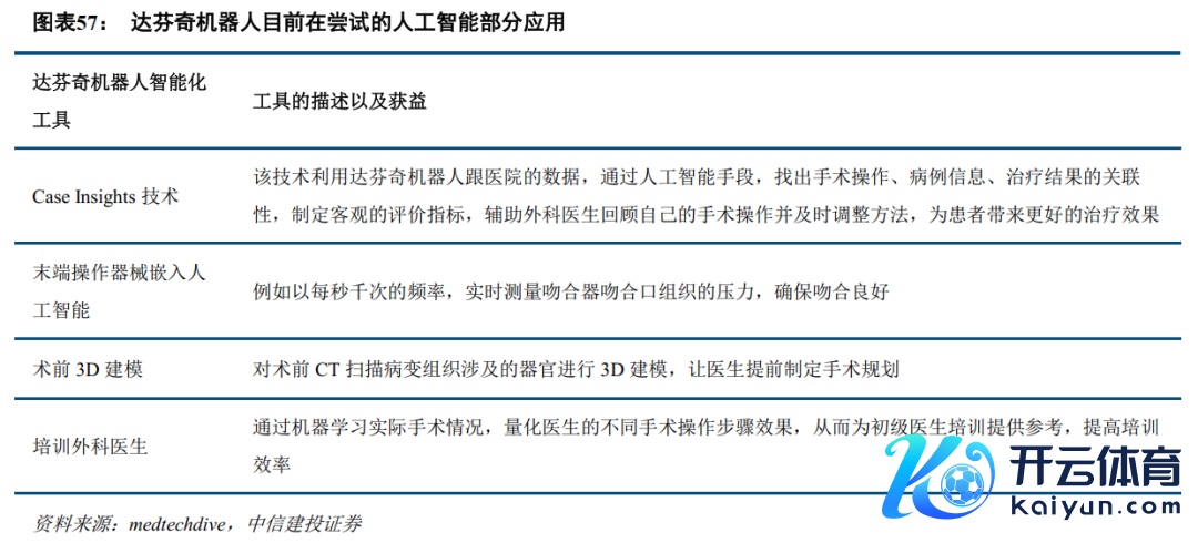 直观外科腔镜手术机器东谈主在AI的应用上一经开展了早期探索。腔镜机器东谈主中,直观外科的达芬奇机器东谈主在寰球处于把持地位。早期的达芬奇机器东谈主简直莫得智能化加合手,机器东谈主仅仅将外科医师的手部动作,传输到机械臂结尾的操作器械。淌若莫得外科医师的输入,达芬奇机器东谈主无法自主操作。跟着达芬奇不休地迭代,东谈主工智能在达芬奇开采中一经有了一些初步的应用。