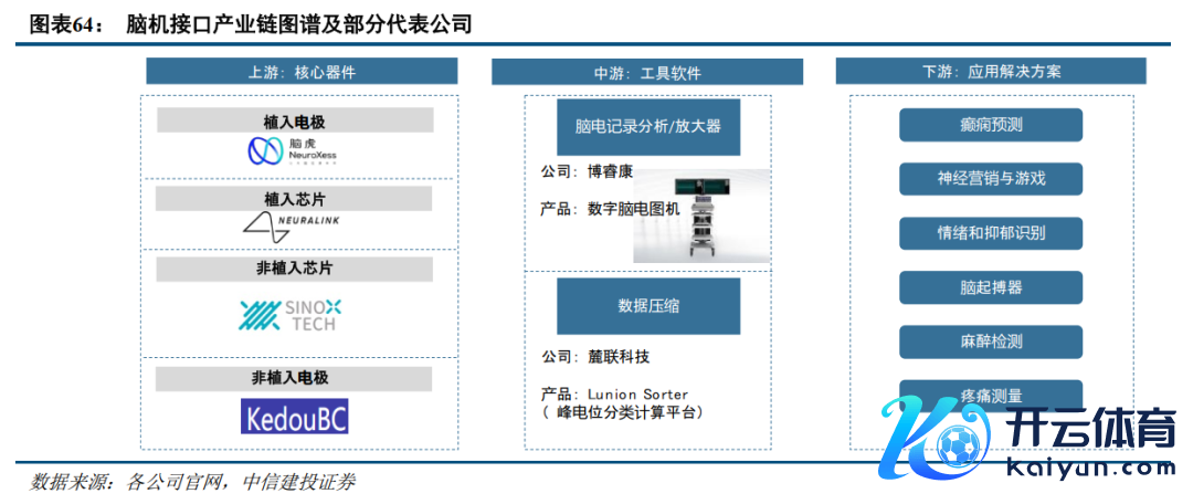 脑机接口产业链上游主要波及核心器件,包括植入电极(脑虎科技等公司,下同)、植入芯片(Neuralink)、非植入芯片(芯动神州)、非植入电极(BiomedProducts、科斗);中游主要波及用具软件,包括脑电记载分析/放大器(AlphaOmega、博睿康),数据压缩(麓联科技);卑劣则是各种应用贬责有推敲,隐秘癫痫预测(诺尔医疗)、神筹划销和游戏(Emotiv)、情谊和抑郁识别(Brainify.AI)、脑起搏器(好意思敦力、品驰)、麻醉检测(易飞华通)等多个有推敲。