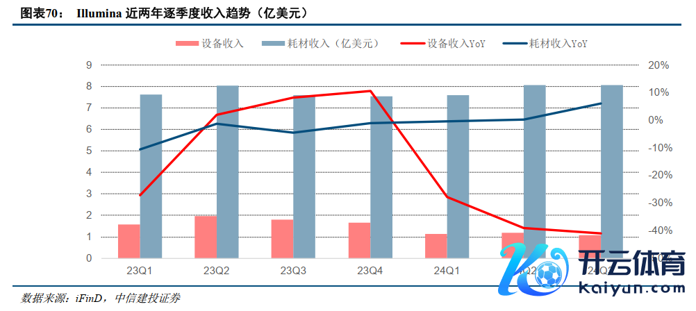 25年基因测序上游有望重回增长轨谈。2024年,国外基因测序上游企业事迹弘扬波动,主要受到多方面成分:1)寰球宏不雅环境变化;2)投融资减少导致下搭客户需求减少;3)本身新产物发布带来的价钱基数变化。以寰球基因测序开采龙头企业Illumina为例,其24Q1-3开采收入3.42亿好意思元,同比下滑36.3%,Q3单季度开采收入1.04亿好意思元,同比-42%,环比-10%。但从另一角度不雅察,Illumina24Q1-3耗材收入23.76亿好意思元,同比增长2%,Q3单季度耗材收入7.41亿好意思元,同比+7%。探求到其新产物发布带来的价钱基数变化,耗材收入同比仍有增长标明卑劣测序行动保合手着健康增长态势。瞻望2025年,咱们觉得跟着目下以好意思国为代表的国外地区插足降息通谈,此前影响寰球基因测序上游的成分中的宏不雅及投融资等成分有望得到改善,价钱基数变化影响在24年迟缓消化,25年基因测序上游有望重回增长轨谈。