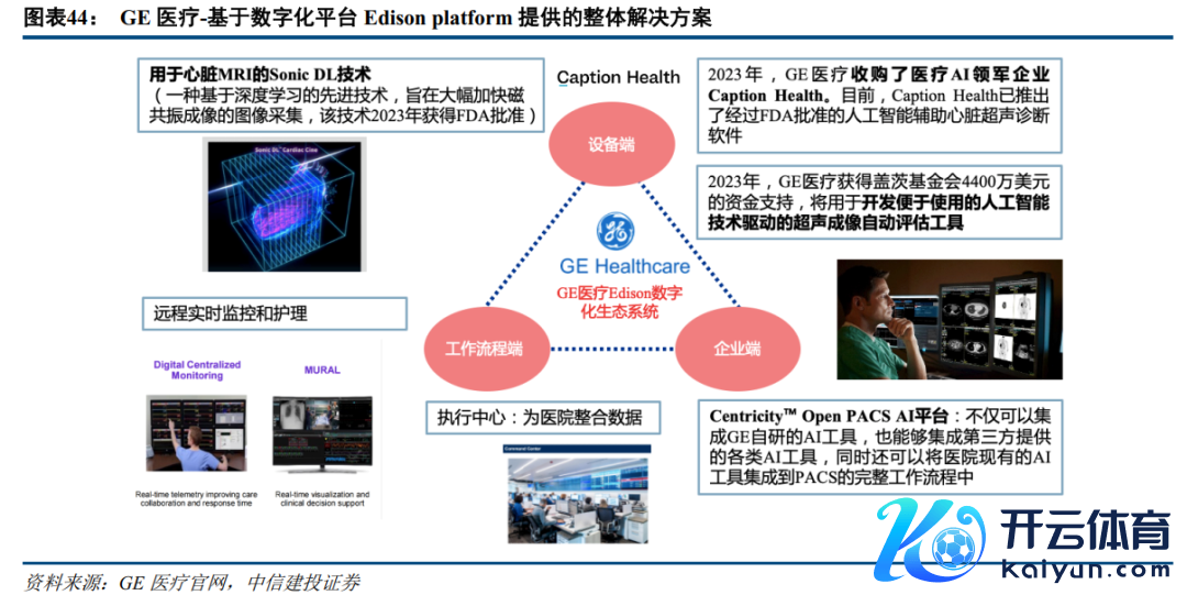 以GE为例:AI和数字化布局是头部医疗开采企业重点布局的标的。医学影像开采行业一经从单一的疾病会诊和调理需求逐步向精确医疗、患者照应、使命经过优化等多元化的需求发展,因此数字化和AI应用逐步成为头部影像开采厂商的重点布局标的。以GE医疗为例,公司2018年推出Edison数字医疗智能平台,基于该平台陆续推出了很多智能化产物和贬责有推敲;2023年,GE医疗收购了医疗AI领军企业CaptionHealth,后者是寰球首个AI援手会诊软件获取FDA批准上市的企业。这次收购不仅丰富了公司超声产物管线,也加快了公司在AI医疗领域的布局。