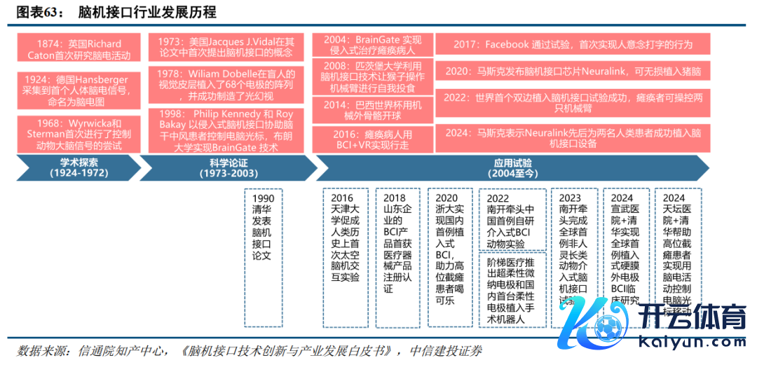 脑机接口作为多学科交叉的前沿本领,国表里商讨进展加快。1874年,英国物理学家RichardCaton初次商讨脑电行动。1973年,好意思国策动机科学家JacquesJ.Vidal初次建议脑机接口办法,象征着脑机接口插足科学论证时期。现时,脑机接口商讨已激励寰球无为关注:本年1月,马斯克暗示第一位东谈主类患者接受了脑机接口公司Neuralink的植入物;齐门医科大学宣武病院连结清华大学团队告示,寰球首例植入式硬膜外电极脑机接口援手调理颈髓毁伤引起的手脚截瘫患者行动才能取得打破性进展;2月,清华大学连结齐门医科大学附庸北京天坛病院团队,利用无线微创脑机接口本领,得手匡助高位截瘫患者扫尾用脑电行动限度电脑光标出动;8月,马斯克暴露Neuralink已得手为第二名东谈主类患者植入脑机接口开采,神气进展得手,植入的开采运转细密无比。