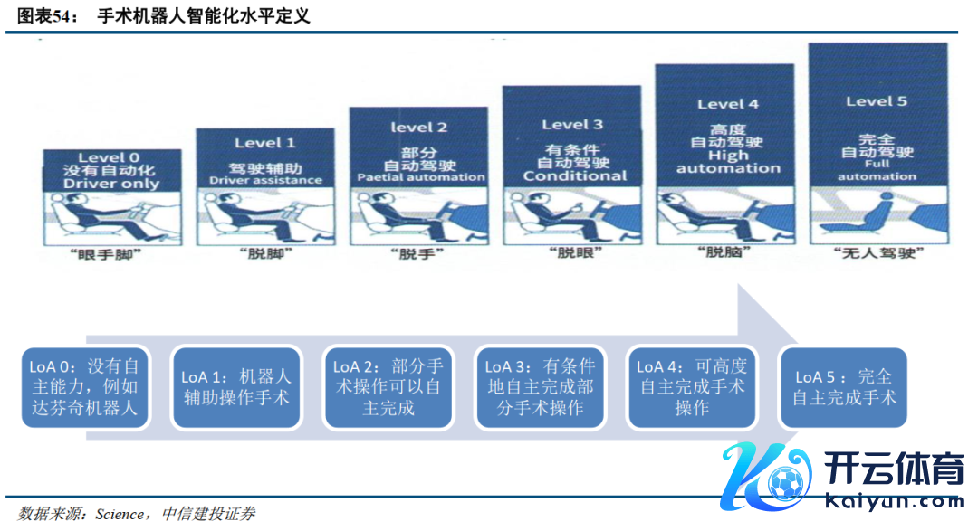 目下医疗机器东谈主的智能化水平还处于比较早期的阶段,发展后劲大。东谈主工智能在医疗机器东谈主中应用的界说,主要指专揽机器视觉、图像分析、导航、机器学习等妙技,使医疗机器东谈主扫尾自主会诊决策、而已手术、完成部仳离术以至通盘手术过程。访佛自动驾驶分为L0-L5等6个品级,医疗机器东谈主按照其智能化程度分为LoA0至LoA5(LevelofAutonomy)。目下来看,大部分主从式操作手术机器东谈主处于LoA0级,部分导航定位手术机器东谈主处于LoA1级,举例史赛克的Mako机器东谈主不错自行实践截骨操作。