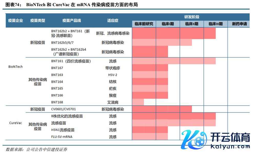 mRNA疫苗开发多种疾病布局和联苗本领。在新冠疫苗的研发中,mRNA本领阐扬了紧要作用,Moderna和BioNTech两家企业凭借mRNA新冠疫苗的快速研发和上市,获取了巨大的买卖化得手。除了新冠疫苗外,两家公司均布局了针对多种传染病的疫苗管线,起劲于贬责目下未得志的疾病扫视需求,或对现存疫苗进行替代升级,如呼吸谈疾病(新冠、RSV、流感等)联苗、遮挡病毒(CMV、EBV、HSV)疫苗等。其他mRNA疫苗相关企业,如CureVac等,也在新冠、流感等传染病疫苗上进行布局。