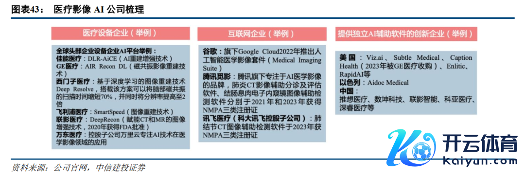AI医疗影像市集的参与者主要分为三类:1)医疗开采企业:国表里医疗影像开采龙头,凭借本身的数据、本领和本钱等上风,通过软硬件取悦的方式对医疗开采进行改革并引颈寰球AI医学影像本领创新升级趋势。2)互联网企业:国表里互联网企业积极布局AI医疗,具备资金和算法上风。3)提供寂寥的AI援手软件和系统的创新企业:比如好意思国的Viz.ai和SubtleMedical探索推出VizSDH、SubtlePET产物,用于脑卒中监测及机器图像质地的擢升,以色列AidocMedical公司研发的BriefCase、HealthCCSng均获FDA上市批准,用于大血管顽固和腹黑成像。