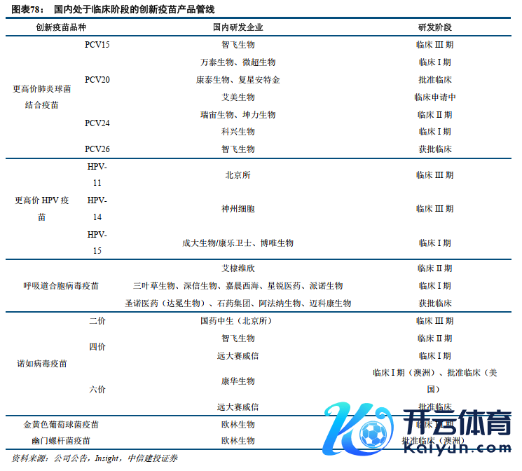 国内创新疫苗研发生机勃勃,后续进展值得关注。目下国内疫苗研发管线合座较为蚁集,同质化倾向显耀。濒临这种情况,各家企业也开展了针对现存产物的升级管线研发布局,如更高价的肺炎球菌疫苗、HPV疫苗,以及带状疱疹疫苗、RSV疫苗等创新品种。此外,部分企业布局了愈加创新的疫苗产物管线,如金葡菌疫苗、诺如病毒疫苗、幽门螺杆菌疫苗等国外企业未布局研发的管线,自大出私有的竞争上风。
