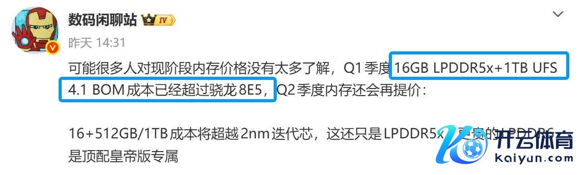 稀有码博主称:可能好多东说念主对现阶段内存价钱莫得太多了解,第一季度16GB LPDDR5x+1TB UFS 4.1 的BOM本钱,就一经超越骁龙8E5,第二季度内存还会再提价。