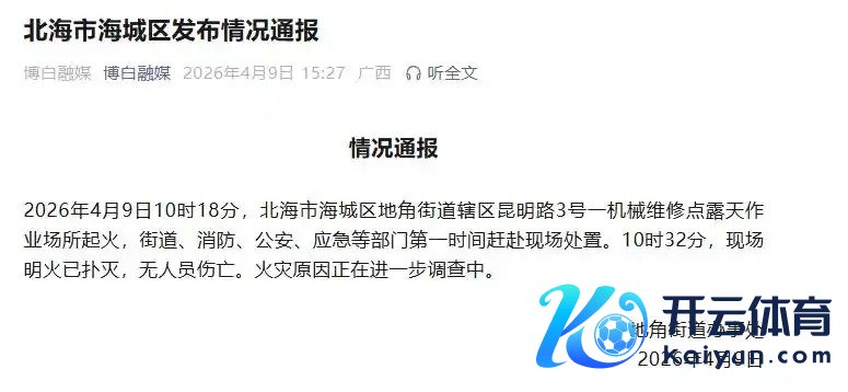 2026年4月9日10时18分,北海市海城区地角街谈辖区昆明路3号一机械维修点露天功课场面生气,街谈、消防、公安、济急等部家世一时辰前往现场处理。10时32分,现场明火已扑灭,无东谈主员伤一火。失火原因正在进一步访谒中。