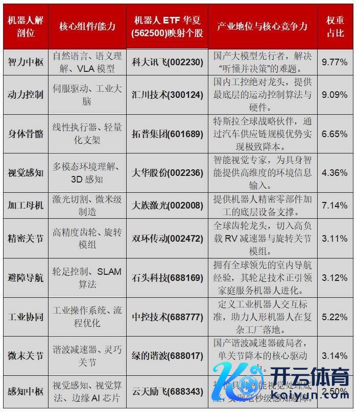 跟着东谈主形机器东谈主进入“1-10”的量产爬坡期,板块波动加重,寻找具有护城河的详情味标的成为投资瑕疵。机器东谈主ETF中原(562500)凭借其全产业链遮盖的特质,成为了布局这一赛谈的首选锚点。为了让投资者更明晰地领悟,咱们将机器东谈主ETF中原(562500)的前十梗概素股与其在机器东谈主体内的功能部位进行逐一双应: