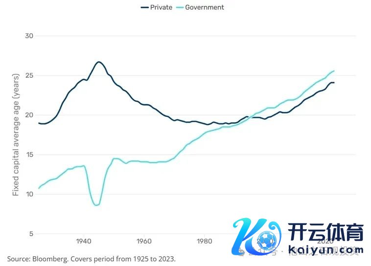 西方的传统基础技术已经老套。下图闪现了按私东谈主和政府钞票诀别的好意思国固定成本的平均年事。这些建成技术需要更新。这是由一系列竞选活动推动的——“升级”、“重建得更好”等等。与此同期,许多枢纽称号并不成反应成本支拨超等周期。咱们的一篮苍生众前十大受益者的往复估值(远期市盈率)比MSCI World低。