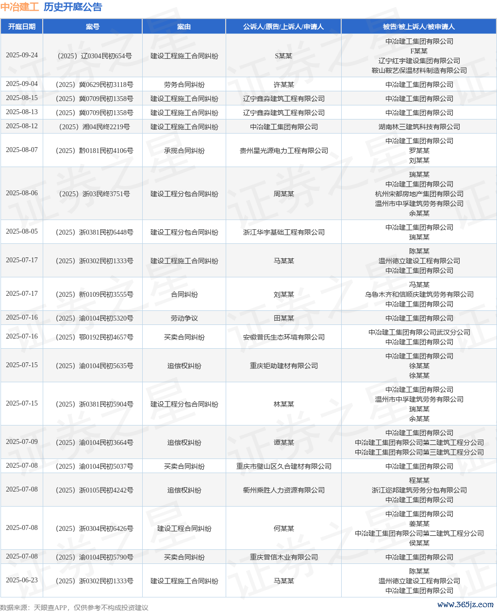 案号:(2025)湘04民终2219号审理法院:湖南省衡阳市中级东说念主民法院案由:配置工程施工协议纠纷当事东说念主信息: 原告/上诉东说念主:中冶建工集团有限公司 被告/被上诉东说念主:湖南林三建筑科技有限公司开庭日历:2025年8月12日凭据统计,近一年内以中冶建工集团有限公司为当事东说念主的历史开庭公告有294则,其中案由为“交易协议纠纷”的公告以65则居首,其次为“配置工程施工协议纠纷”有55则,“配置工程分包协议纠纷”有36则。历史开庭公告(前20条)如下: