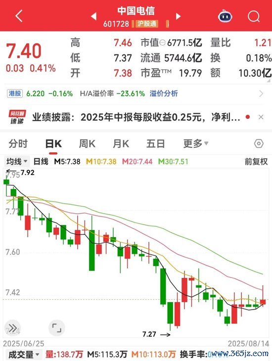 中国电信当天股价涨0.41%,最新收盘价7.4元/股,年内股价累计高潮3.68%。