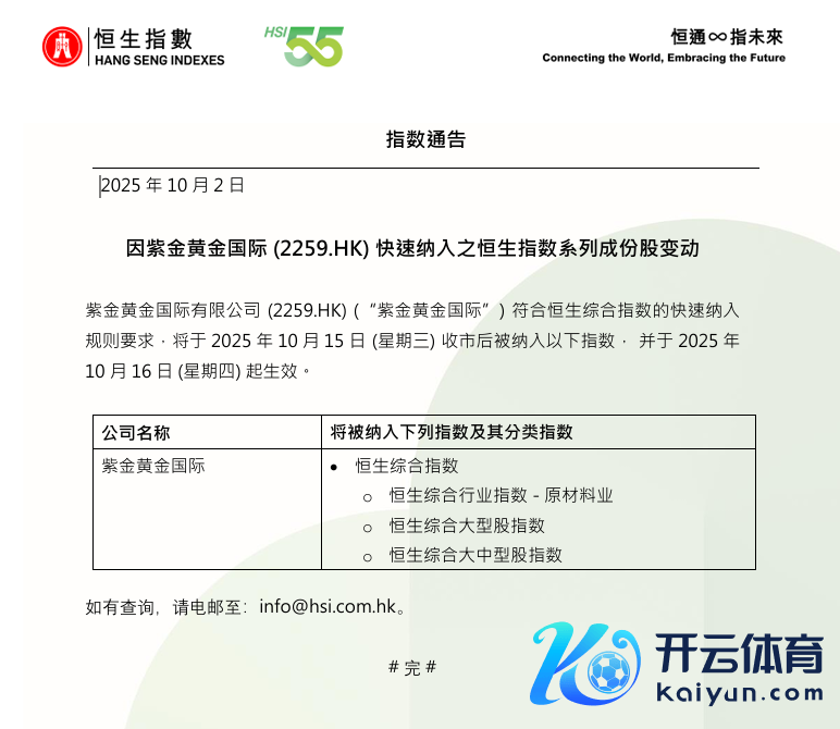 恒生指数公司发布公告:紫金黄金海外有限公司(2259.HK)(“紫金黄金海外”)合乎恒生概括指数的快速纳入礼貌条件体育游戏app平台,将于2025年10月15日(星期三)收市后被纳入恒生概括指数,并于2025年10月16日(星期四)起奏效。
